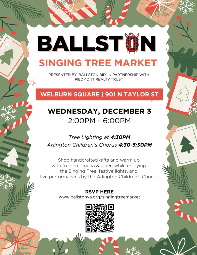 The Singing Tree Market is a one-day holiday market featuring local makers, festive music, and seasonal cheer. Shop for unique gifts, enjoy complimentary hot cocoa and spiced cider(while supplies last), and take in live performances by the Arlington Children’s Chorus from 4:30 to 5:30 PM.